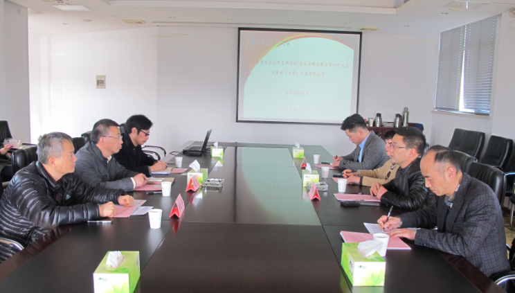 裴育校长介绍了学校的发展历程,从经济学家的视角分析了国家治理与国家审计的广阔发展前景,以及如何将审计参与到政府治理当中。裴校长说:”校企合作的开始要着重巩固合作构架,确立科学的合作发展导向,争取产生具有标志性的成果,充分体现其社会价值,并希望双方的合作进行的更远、更好。”科研部副部长洪涛就双方合作表达了自己的看法并做了精彩的评论。他认为,双方合作项目具有鲜明的人文情怀,校企发展的终极服务是一致的,都是以“健康”为共同的目标,并即兴创作诗一首:“二月春风染柳烟,审园正是好花天,同心共筑幸福梦,南审润天把手牵”,表达了对双方未来的合作发展充满期待。
