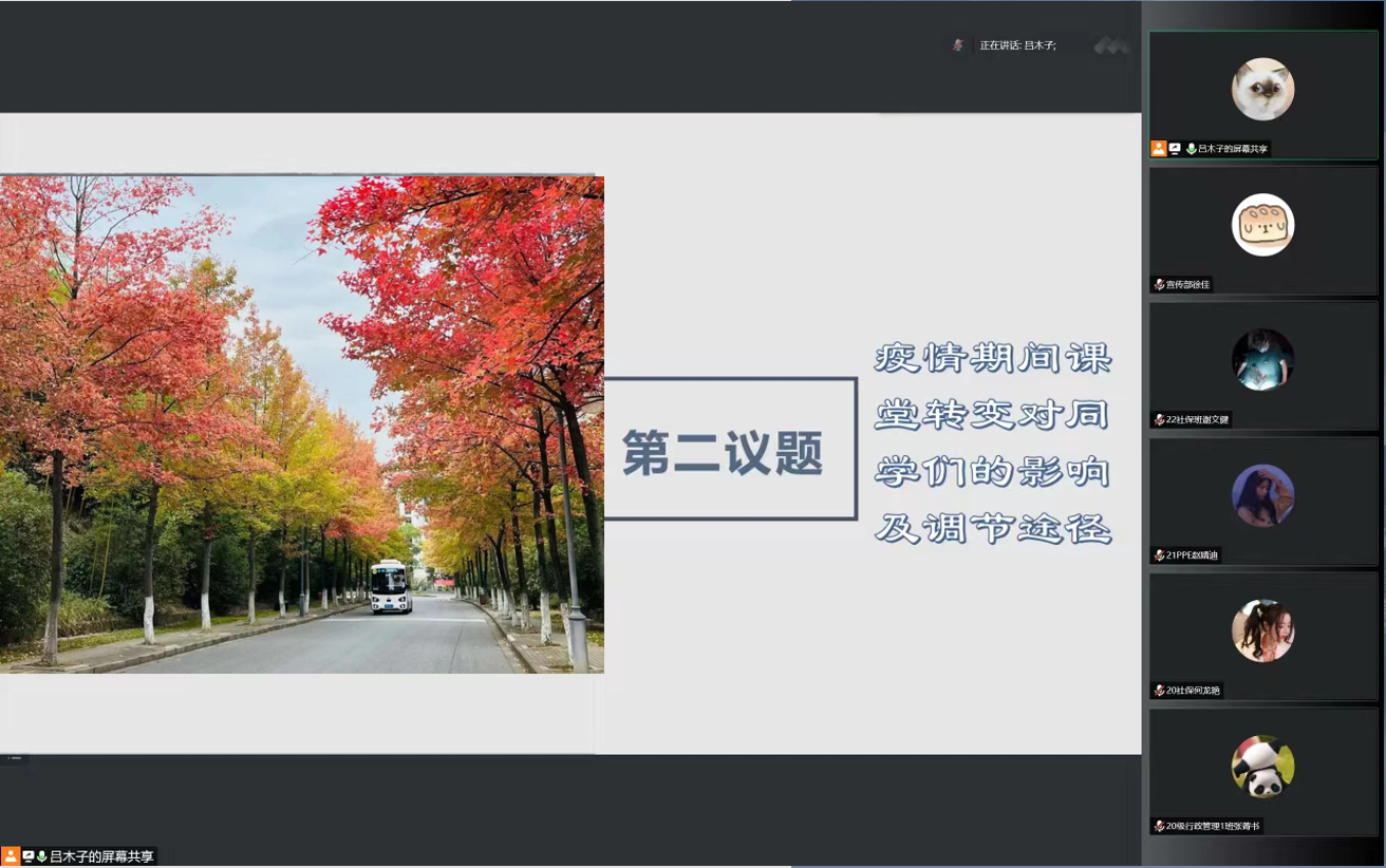 第一议题讨论结束后,座谈会进入第二议题,与会同学就“疫情期间课堂转变对同学们的影响及调节途径”进行讨论。学习环境差、效率低、沟通困难等问题引发了大家的共鸣。在学生代表的交流讨论下,最后总结提出了制定计划、互相监督、去自习室自习等多种有效解决办法。