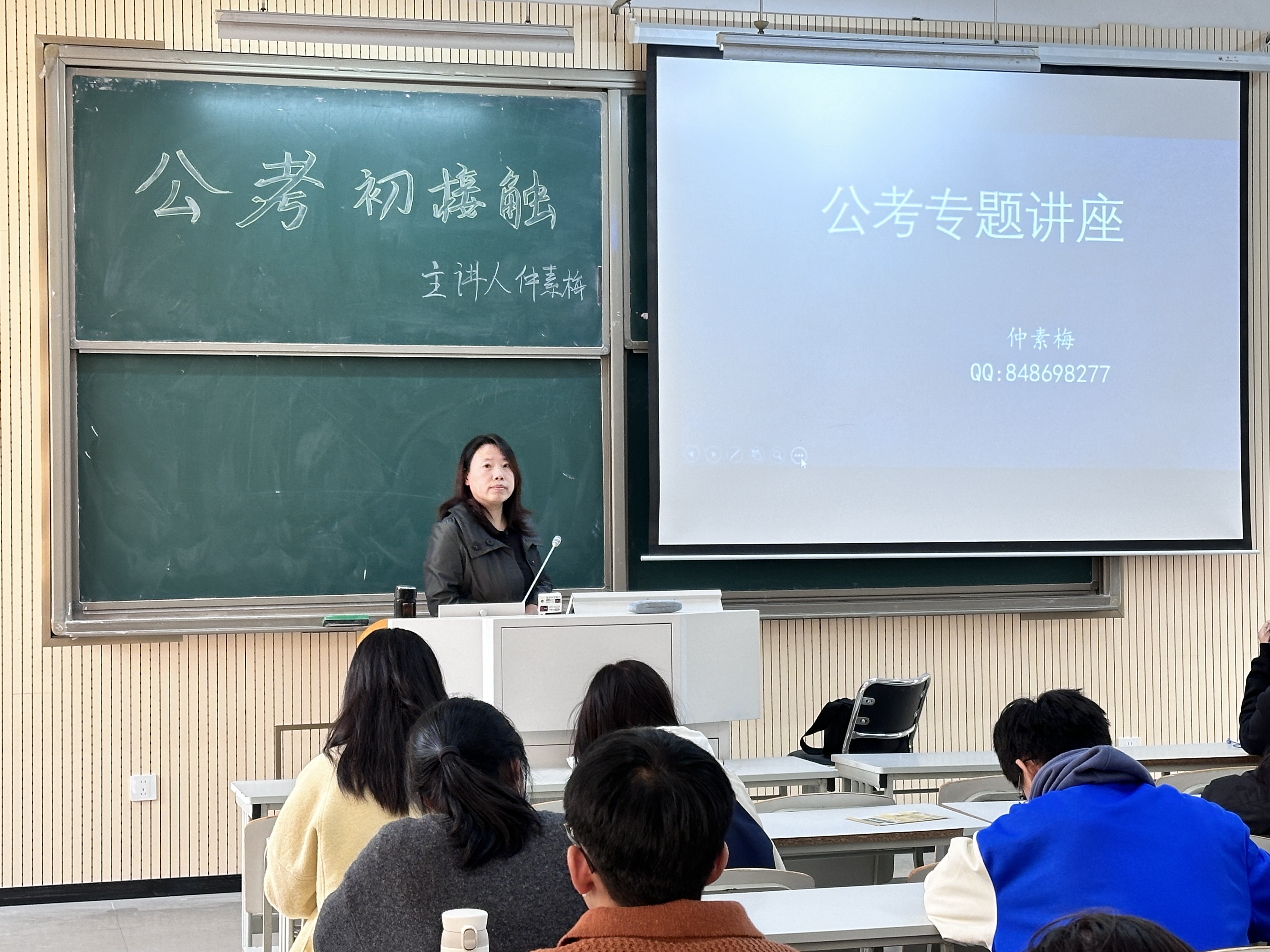 活动伊始,仲素梅老师热情开场。老师向大家讲解我国公务员的概念,并通过组图展示了我国当前公务员的分布情况以及公务员考试的现状,一系列数据让同学们对公务员考试竞争的激烈程度有了更直观的感受。老师说到,公务员是选拔性考试,是为国家选拔人才的。
